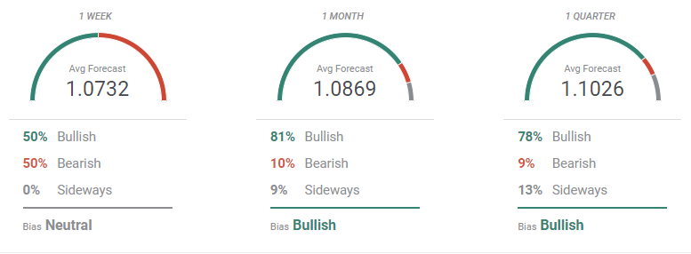 The Overview chart also hints at a potential recovery. The three moving averages have lost their bearish slopes, and while the shorter one remains flat, the longer ones are slowly recovering their upward strength near multi-month highs. Bulls seem to hesitate in the near term, as most targets accumulate between 1.0600 and 1.1000 in the monthly perspective but the range in the quarterly view is up to 1.0900/1.1200.