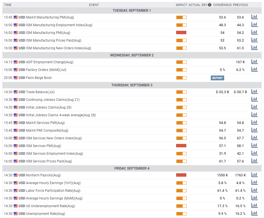 The economic calendar is packed, culminating in Friday's all-important Non-Farm Payrolls report for August. Investors want to see if the lapse of special fiscal stimulus at the end of July – and the ongoing coronavirus crisis – caused the recovery to slow down.
