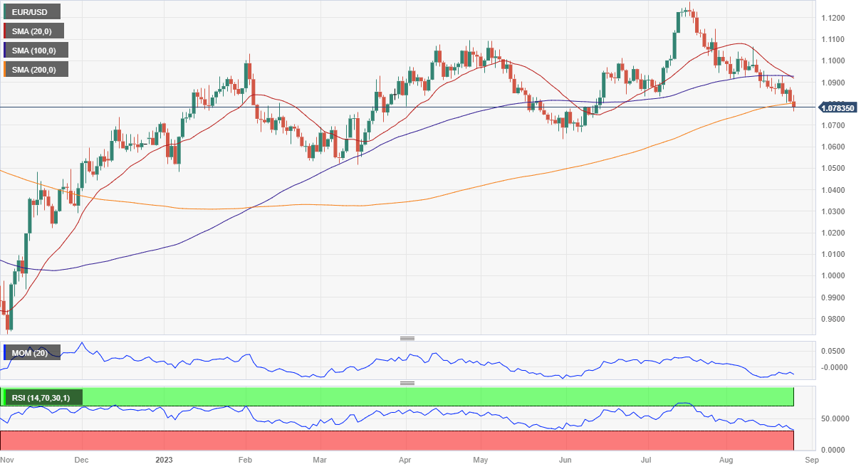 The daily chart shows that the pair is battling with a mildly bullish 200 SMA at around 1.0790. At the same time, the pair develops well below the 20 and 100 SMAs, with the shorter crossing below the longer one in the 1.0910/20 price zone. Finally, technical indicators have lost their bearish momentum but consolidate near oversold readings, not enough to confirm an interim bottom. It is also worth noting that the pair has posted a lower low and a lower high on a daily basis, in line with the dominant bearish trend.