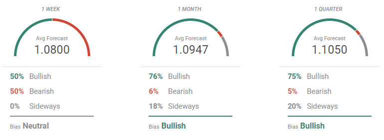 The FXStreet Forecast Poll shows speculative interest in the near term but also that most analysts are betting for a tide change. The pair is neutral in the weekly perspective, with the pair seen around 1.0800, while bullish in the monthly and quarterly views. Buyers are roughly 75% of the polled experts, while less than 10% foreseen lower lows.