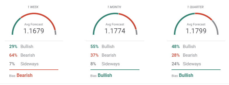 The FXStreet Forecast Poll for the EUR/USD pair shows that the bearish pressure on the pair won’t last long. A new leg lower is expected next week, but the pair is then seen turning bullish. On average, however, the pair is seen neutral and confined to familiar levels. Bulls’ strength is clearer in the monthly view, as 55% of the polled experts are going long. Surprisingly, the number of bears decreases as time goes by, down to 28% in the quarterly view.