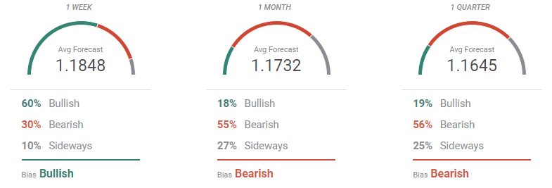The FXStreet Forecast Poll shows that investors expect dollar’s weakness to continue in the short-term, as the sentiment towards the pair is bullish in the weekly view, seen on average at 1.1848. A steep corrective decline is expected afterwards, as the bears become a majority in the monthly and quarterly views, with the pair seen at 1.17 and 1.16 respectively.