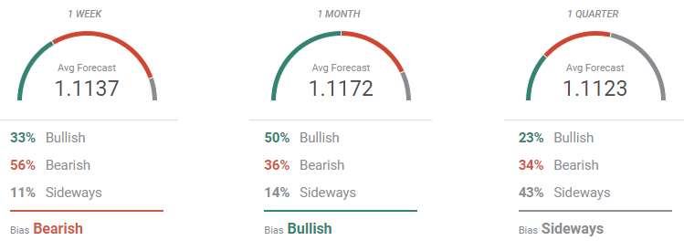The FXStreet Forecast Poll shows that those betting on lower lows are a majority in the near term, with most targets accumulating between 1.10 and 1.11. The spread of possible targets widens in the monthly view but shrinks again in the quarterly perspective. On average, the pair is seen around the current level in the three time-frame under study, although bulls are a majority in the monthly perspective, with 50% of the polled experts looking for an upward corrective advance.