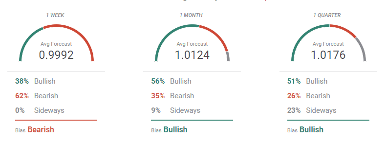 The FXStreet Forecast Poll shows that the EUR/USD pair may remain under pressure in the near term but will likely recover afterwards. Bears dominate the weekly view, standing at 62% and with an average target of 0.9992. The tie changes in the monthly perspective, with bulls up to 56% and the pair seen above 1.0100 on average. Buyers seem to be in control of the quarterly view, with the pair seen averaging 1.0176. It is worth noting that the number of those betting for lower levels declines as time goes by.