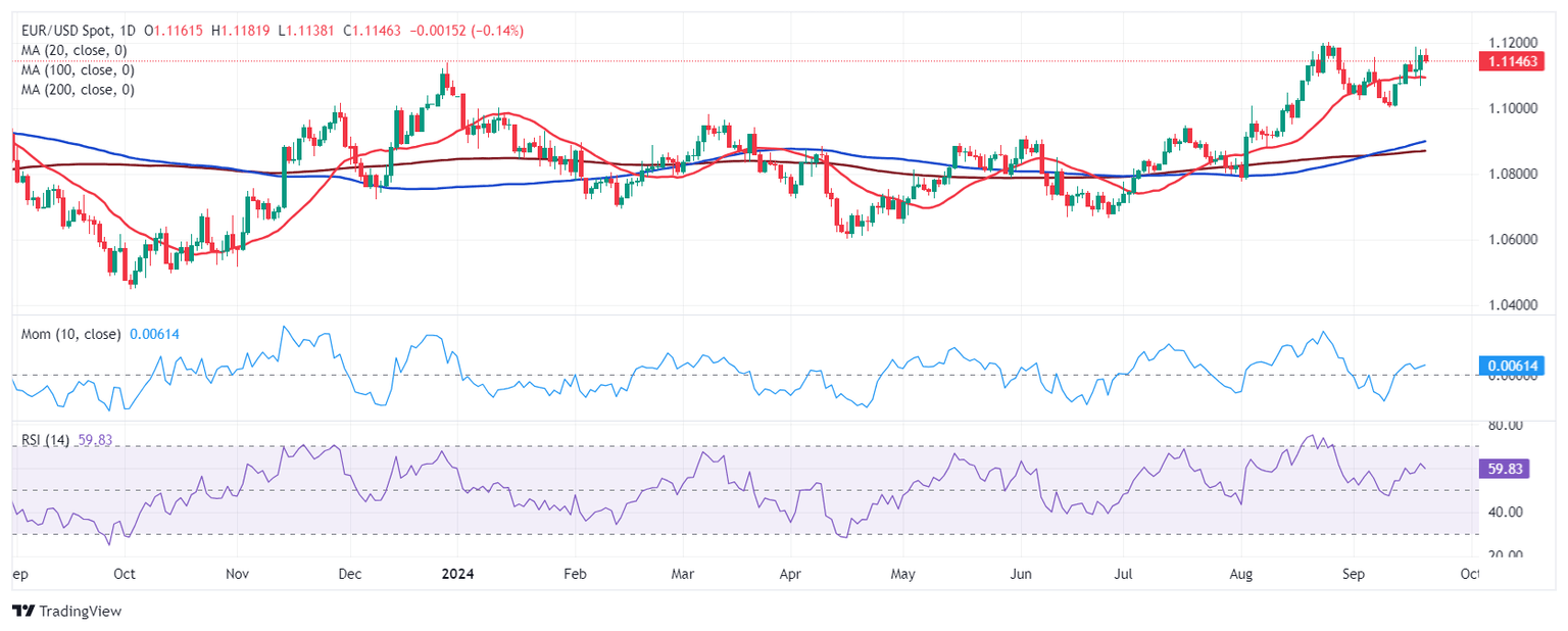 EUR/USD is also bullish in its daily chart despite the bullish momentum receding. The 20 SMA provides support in the 1.1090 region, while the longer moving averages grind higher far below the shorter one. Finally, technical indicators have turned marginally lower but remain within positive levels.