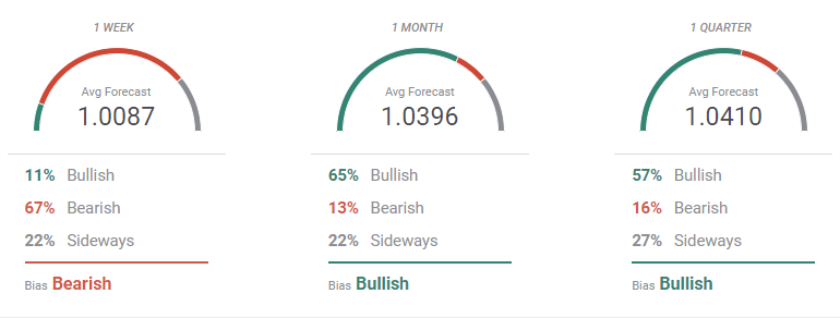 The FXStreet Forecast Poll suggests that the pair is close to an interim bottom. Bears are still in control in the weekly perspective, as bears stand at 67% of the polled experts, with the pair seen on average at 1.0087. However, there is a strong shift in sentiment in the monthly and quarterly perspectives, as bulls take over, while those betting on a decline decrease sharply. The pair is seen then returning to the 1.0400 region on average.