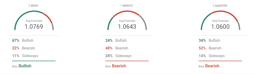 The sentiment around EUR/USD and according to the FXStreet Forecast Poll is bullish in the near term, but bearish in the wider perspective. 67% of the polled experts expect the pair to trade at higher than current levels, with an average one-week target at 1.0769. Bears take the lead in the monthly view, aiming for 1.0643 while retaining control on a quarterly basis when the pair is seen averaging 1.0600.