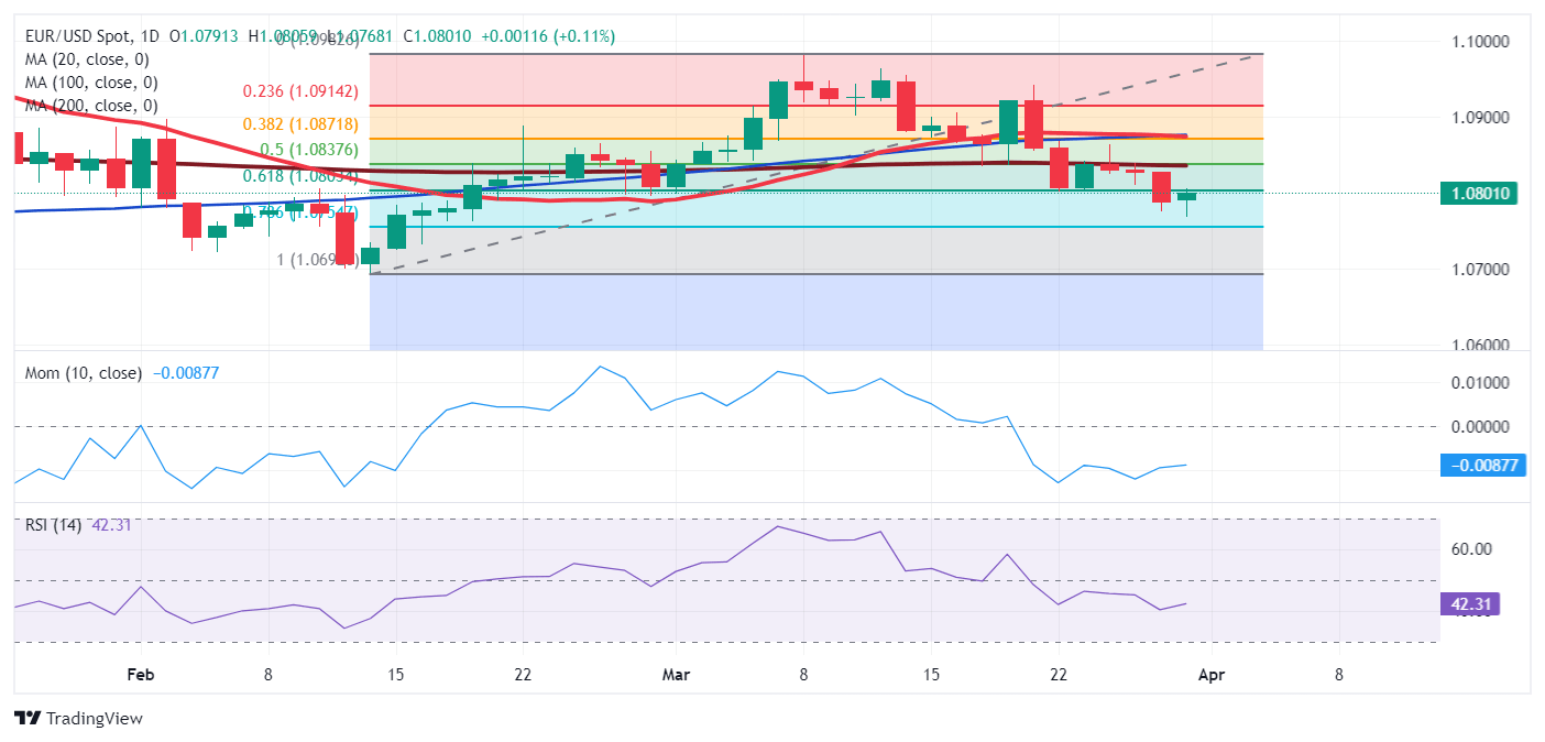The EUR/USD pair closed in the red for a third consecutive week, ending March just above 1.0767, the monthly low. The US Dollar started the week with a soft tone but started grinding higher on Tuesday, finally gathering momentum late on Thursday amid hawkish comments from Federal Reserve (Fed) officials.