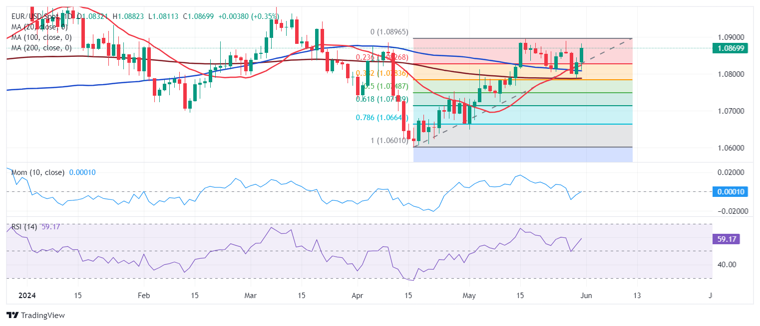 The EUR/USD pair’s daily chart shows that it met buyers at around 1.0782, the 38.2% Fibonacci retracement of the latest bullish run measured between 1.0600 and 1.0894. Overall, the pair is bullish, as it is developing above all its moving averages, with the 20 SMA maintaining its bullish slope after crossing above the longer ones, which anyway remain directionless. Finally, technical indicators have bounced from around their midlines and aim higher with limited strength, still signaling buyers are in the driver’s seat.