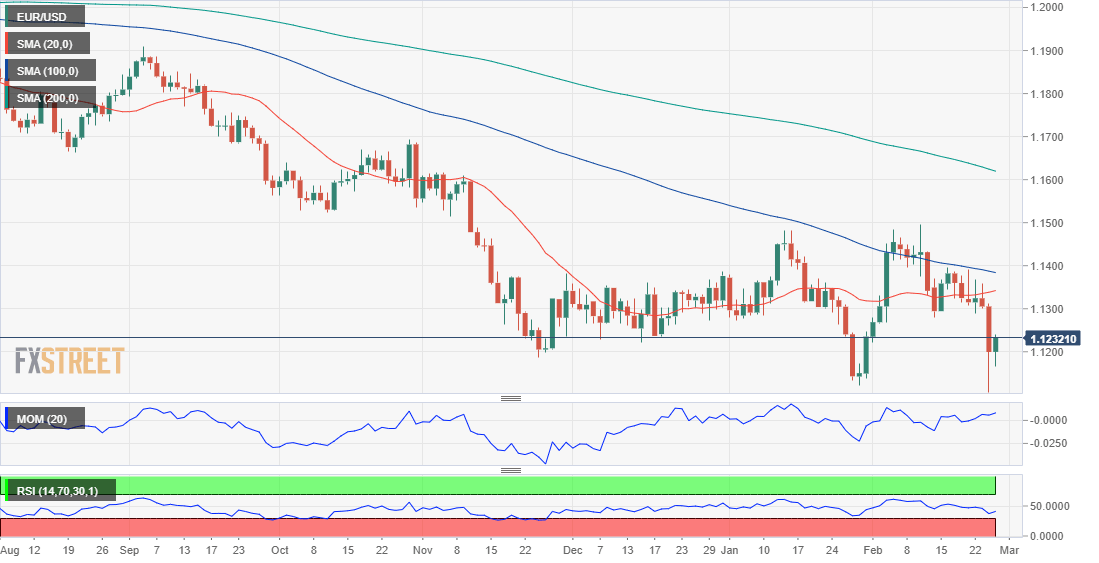 The EUR/USD pair is trading around 1.1230 and is poised to resume its long-term slide after completing its corrective advance. The weekly chart shows that sellers appeared around a mildly bearish 200 SMA at the beginning of the week, to later defend the upside around a firmly bearish 20 SMA, which stands below the longer ones. Technical indicators, in the meantime, remain within negative levels, and the RSI resumed its decline, reflecting increased selling interest.