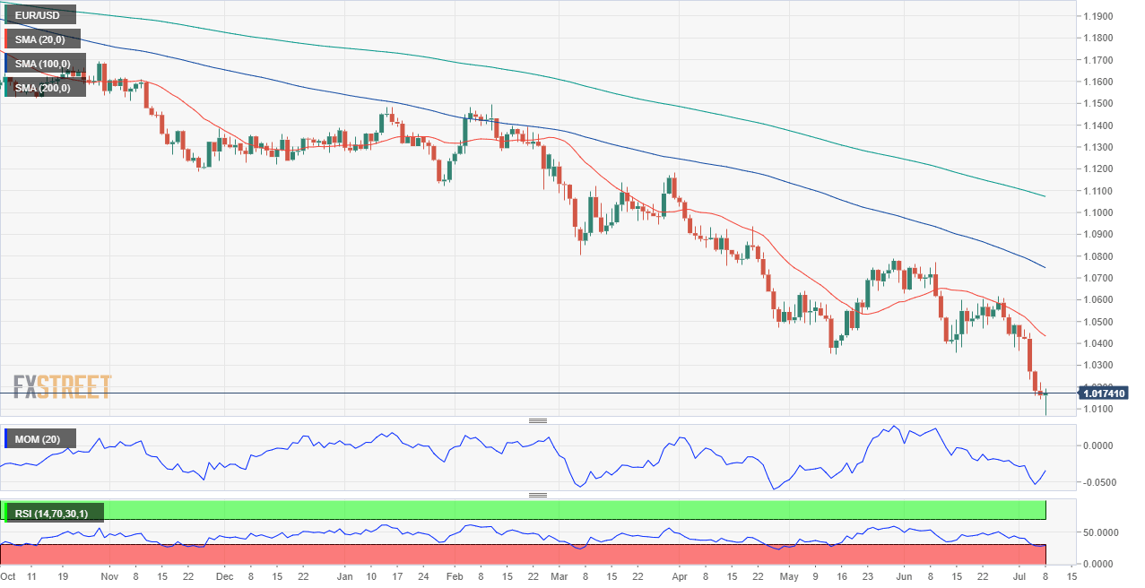 The EUR/USD pair plummeted to a 20-year low of 1.0071 on Friday to end the week at around 1.0170. Panic took over financial markets amid lingering recession fears and mounting inflationary pressures, spiced with an energy crisis in Europe, courtesy of Russia.