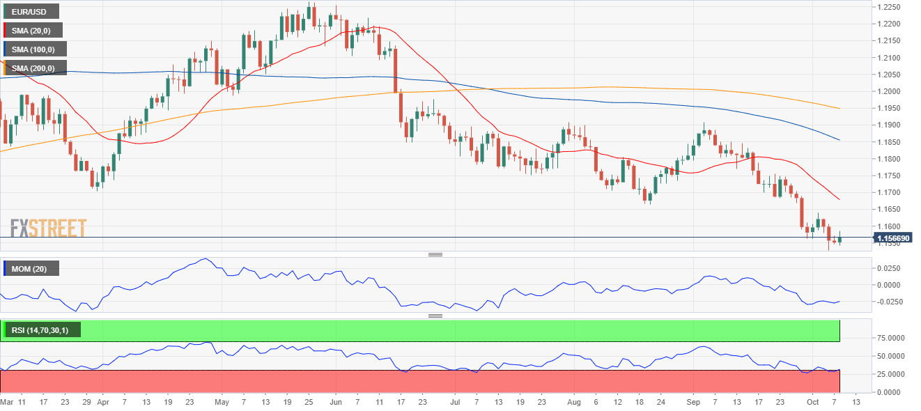 The EUR/USD pair remains below the 1.1600 level, and the weekly chart shows that the pair is posting losses for a fifth consecutive week. The pair is currently struggling with the 200 SMA and trading a handful of pips below the 100 SMA. Meanwhile, the 20 SMA maintains a strongly bearish slope well above the current level. At the same time, technical indicators remain within negative levels, consolidating losses near their September lows.