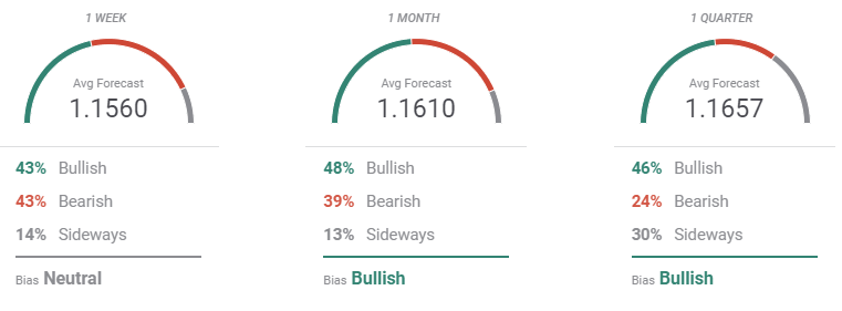 According to the FXStreet Forecast Poll, the pair will remain depressed in the near term, as, on average, the pair is seen around 1.1560 in the weekly perspective, with the number of bears and bulls at 43%. Bulls gain some ground in the monthly view, accounting for 48% of the polled experts, but decreasing to 46% in the three-month perspective. Overall, speculative interest seems unwilling to buy the shared currency.