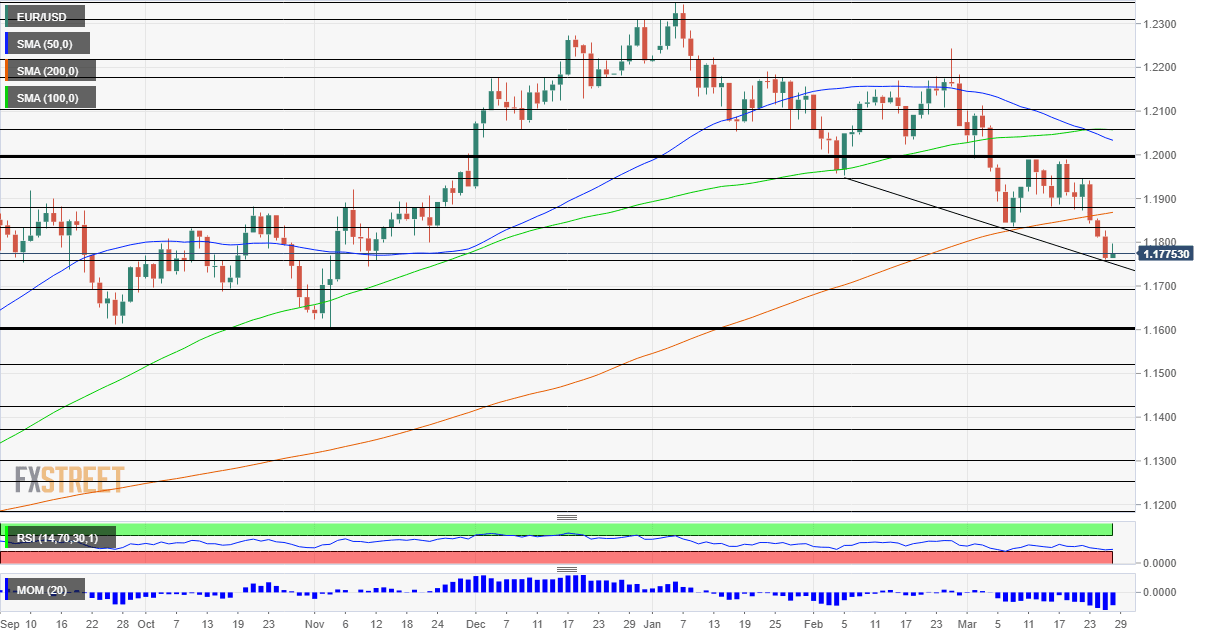 Euro/dollar has dropped below the 200-day Simple Moving Average – a clear bearish sign. The world's most traded currency pair continues suffering from downside momentum on the Relative Strength Index (RSI) is still above 30 – outside oversold territory, at least for now.