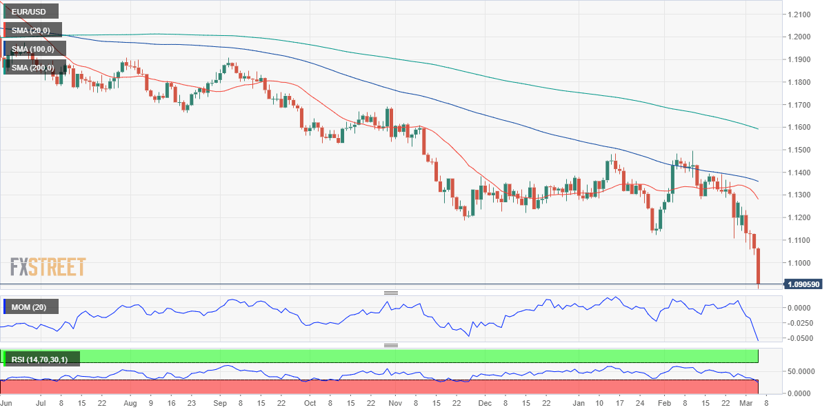 - EUR/USD pierced the 1.1000 level, further signaling a continued decline ahead.