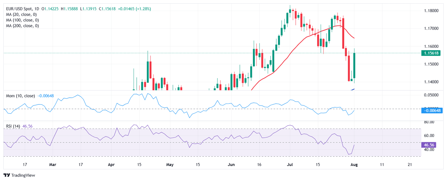 The EUR/USD pair bottomed at 1.1391 on the first day of August, its lowest in over a month. The US Dollar (USD) found legs regardless of the market sentiment, maintaining its positive momentum throughout quite a busy week, but finally gave up on Friday after dismal United States (US) data. The pair finally settled at around 1.1550, still holding onto substantial weekly losses.
