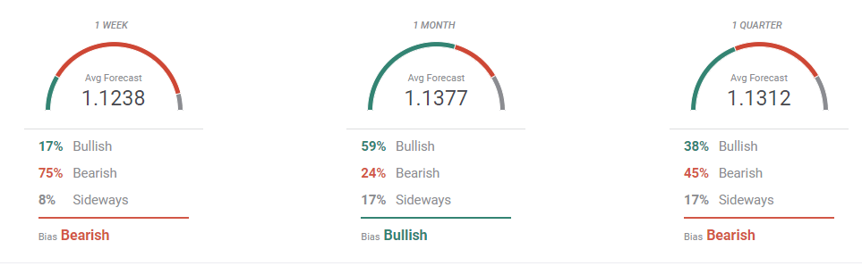 The FXStreet Forecast Poll hints at another leg south for EUR/USD. 75% of the polled experts see the pair down in the near term perspective, with the pair averaging 1.1238. Bears decrease drastically in the monthly view, down to 24%, while bulls account for 59%, with the pair seen then recovering above the 1.1300 threshold. Finally, bears retake control in the quarterly view, although, on average, the pair is seen holding around 1.1300.