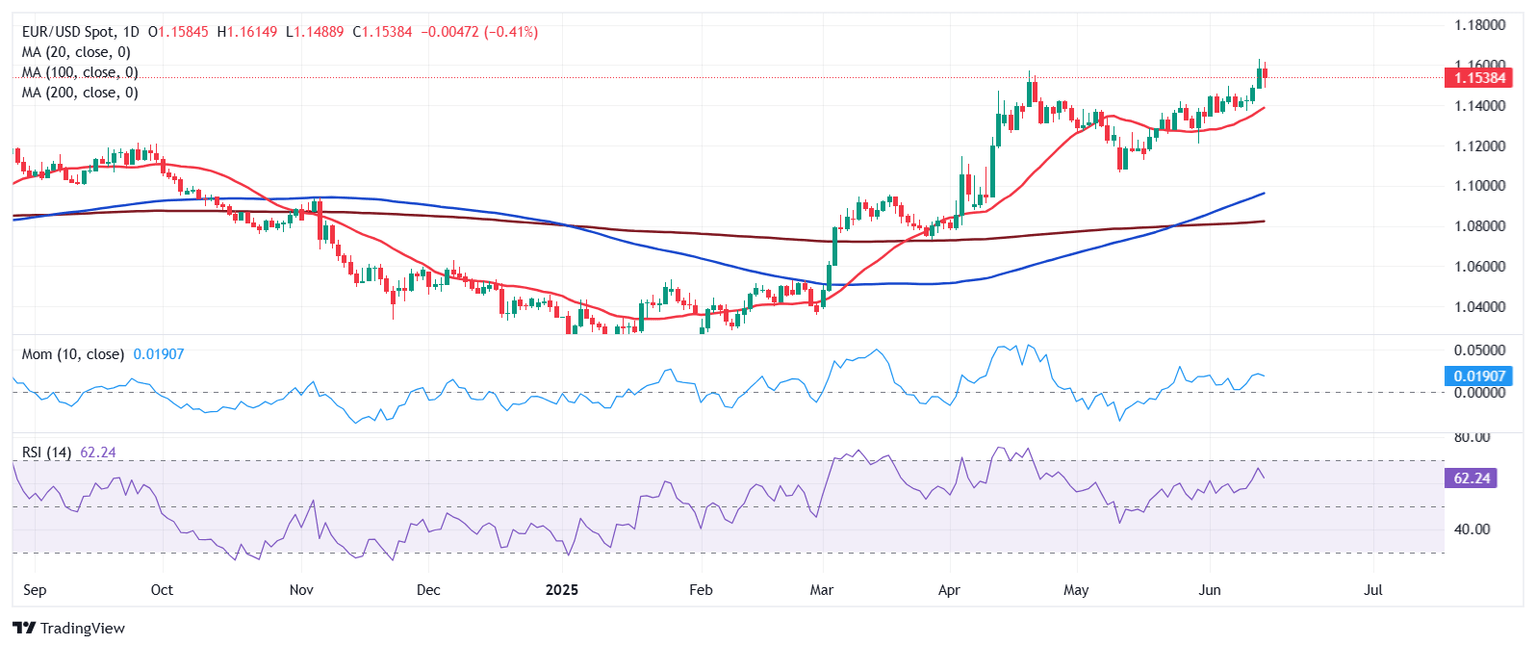 EUR/USD peaked at 1.1631 in the second week of June, shedding roughly 100 pips on Friday to settle at around 1.1540. The news feed was packed with trade war and geopolitical headlines that shaped the market’s sentiment. Trade talks between the United States (US) and China retained the spotlight throughout the first half of the week, while by the end of it, escalating tensions in the Middle East stole the show.