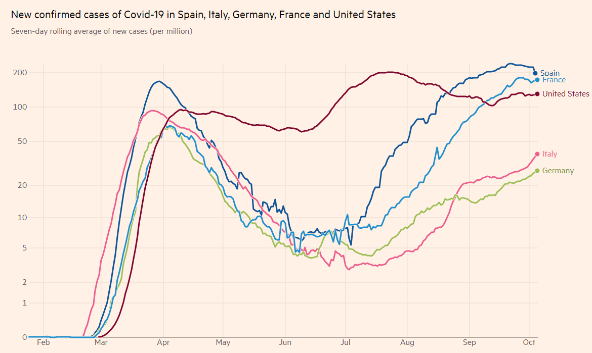 European infections: The eurozone is faring even worse in recent weeks. Bars in Paris were ordered to shutter, and so was nightlife in Berlin. Madrid is under lockdown and remains Europe's hotspot. Spain's Services PMI dropped considerably, potentially serving as the canary in the coal mine for other countries.