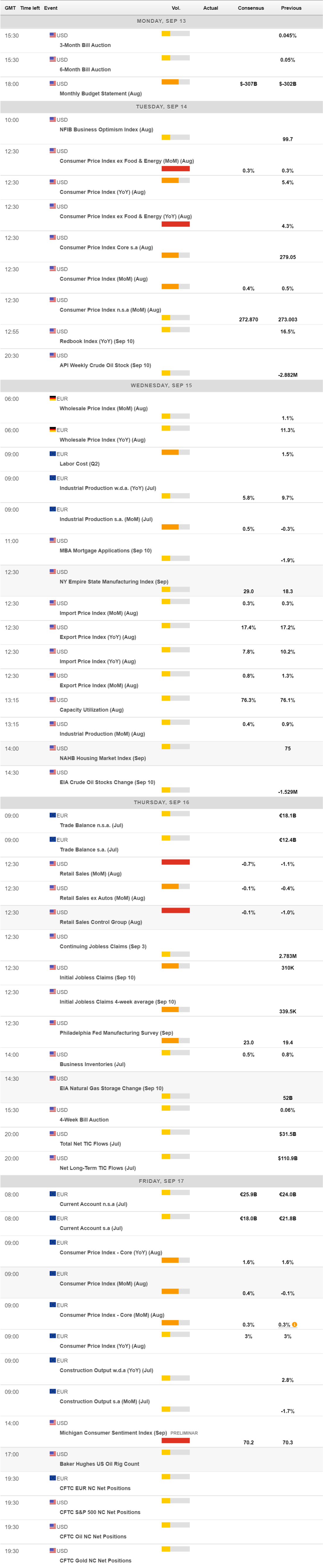 In the upcoming days, attention will return to US data. The country will publish the final reading of August inflation data and August Retail Sales, foreseen down 0.7% in the month. Finally, on Friday the focus will be on the preliminary estimate of the September Michigan Consumer Sentiment Index, foreseen at 70.2.
