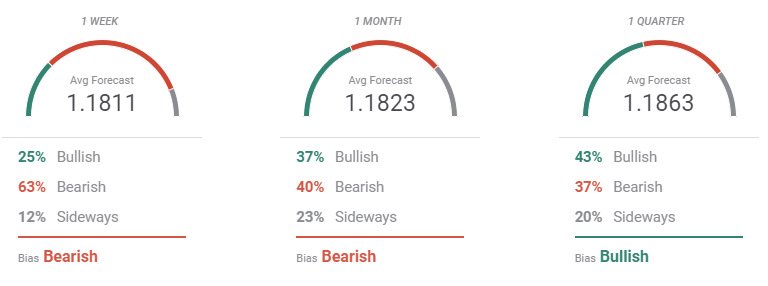 According to the FXStreet Forecast Poll, the EUR/USD pair will likely remain under pressure in the upcoming weeks. Bears are a majority in the weekly and monthly perspectives, although on average, the pair is seen holding above the 1.1800 figure. In the quarterly view, the number of those betting for higher targets increases to 43%, overshadowing those looking for a decline.