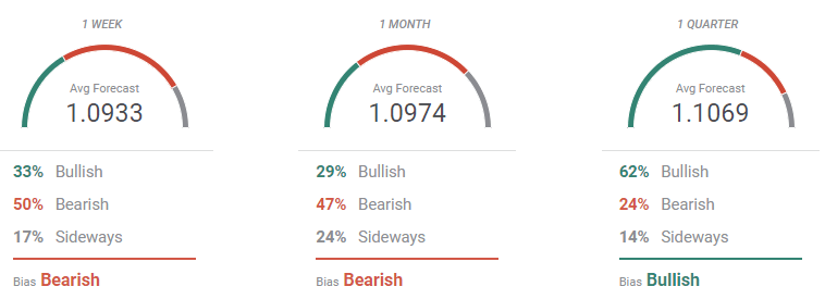 The FXStreet Forecast Poll shows that bears outpace bulls in the weekly and monthly perspectives, although EUR/USD is seen holding above the 1.0900 threshold, on average. In the quarterly view, however, bulls take the lead, jumping to 62% of the polled experts vs roughly 30% in the previous periods analyzed. Still, the pair is seen holding into familiar levels, with the average target at 1.1069.