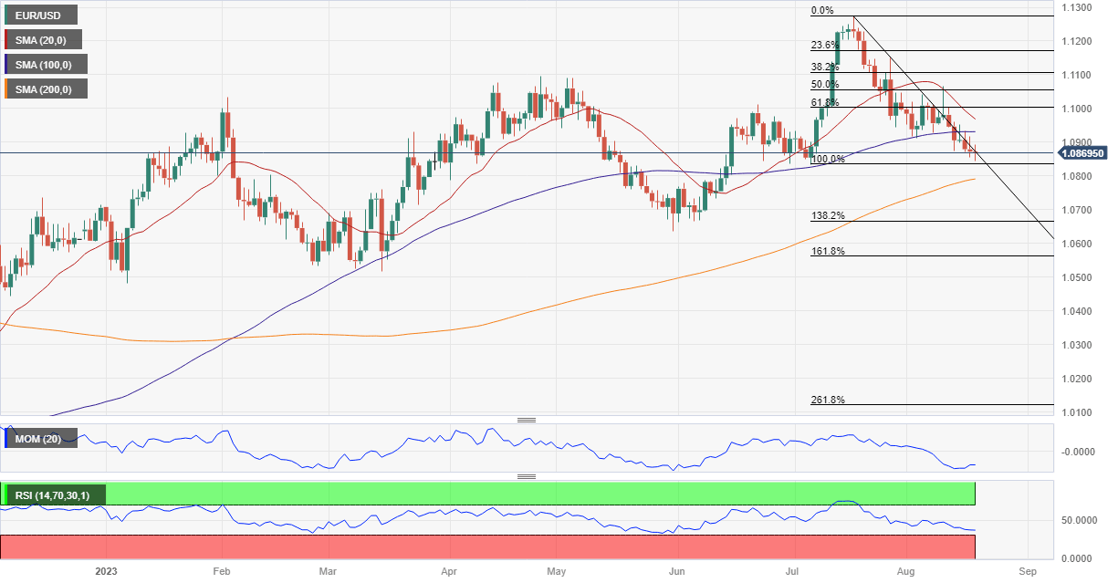 The EUR/USD pair has been on the back foot ever since hitting 1.1275 on July 18. It has closed in the red for five consecutive weeks, and it stands on the brink of piercing the July monthly low at 1.0833. Nevertheless, there are no signs of downward exhaustion in the long term. On the contrary, it seems the pair could accelerate its slump in the mid-term.