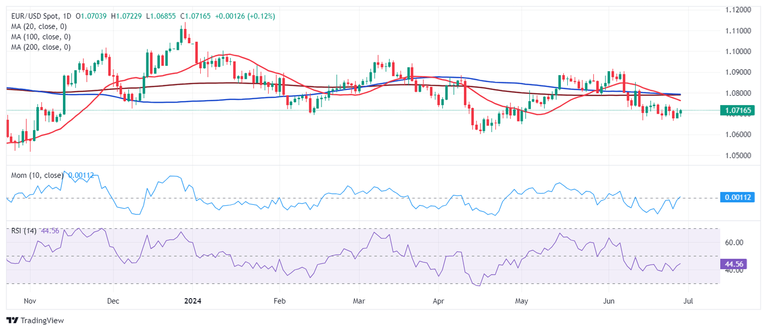 The EUR/USD pair ends June with losses and barely holds above its monthly low set at 1.0665. The weekly chart shows a directionless 100 Simple Moving Average (SMA) reinforces the support area, limiting the downside for a third consecutive week. At the same time, the 20 SMA grinds lower above the current level with limited downward strength. Finally, technical indicators consolidate within negative levels, failing to provide clear directional clues, albeit skewing the risk to the downside.