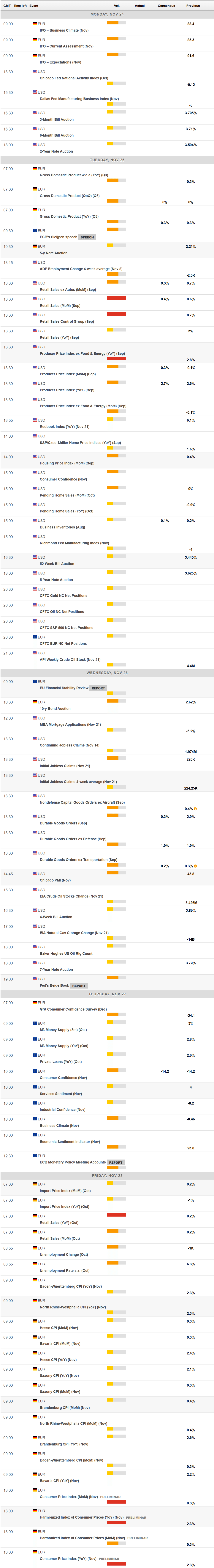 In the upcoming days, Germany will unveil the November IFO Business Climate survey, the final estimate of the Q3 Gross Domestic Product (GDP), October Retail Sales, and the flash estimate of the November HICP. The Eurozone macroeconomic calendar will be lighter, as the most relevant figure scheduled is the November Consumer Confidence.