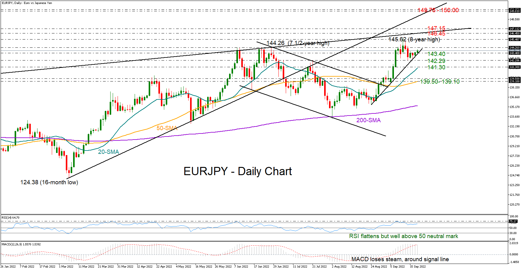 EURJPY stepped on the short-term ascending trendline, as it halted last week’s pullback from the new eight-year high of 145.62.