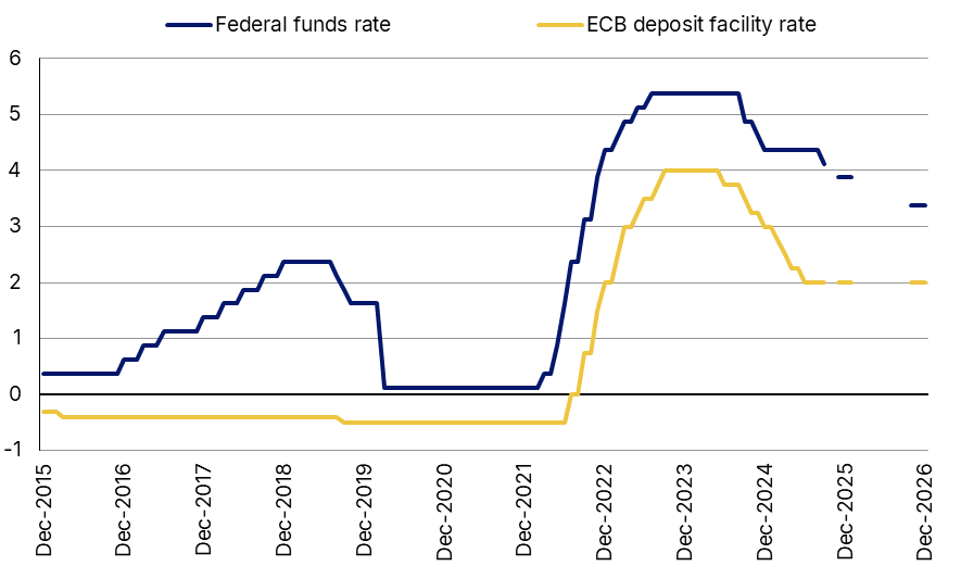 Dashed lines on graphic in 2025 and 2026 designate Scope forecasting for year-ends 2025 and 2026. The federal funds rate represents the mid-point of the Federal Reserve’s target range. Source: central banks, Scope Ratings forecasts.