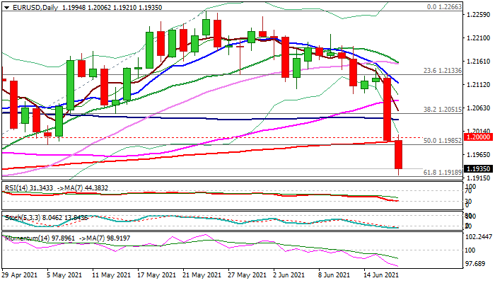 Massive Wednesday bearish daily candle (down 1.1% for the day, the biggest daily fall since 19 March 2020) weighs heavily, while today’s fresh bearish acceleration generated strong negative signal on break of 200DMA (1.1992) after Wednesday’s action registered close below psychological 1.20 support.