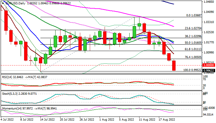 The Euro is establishing below parity level and is pressuring 2022 low at 0.9952, on track for the first daily close below 1 dollar since Nov 2002, following a false break in mid-July this year.