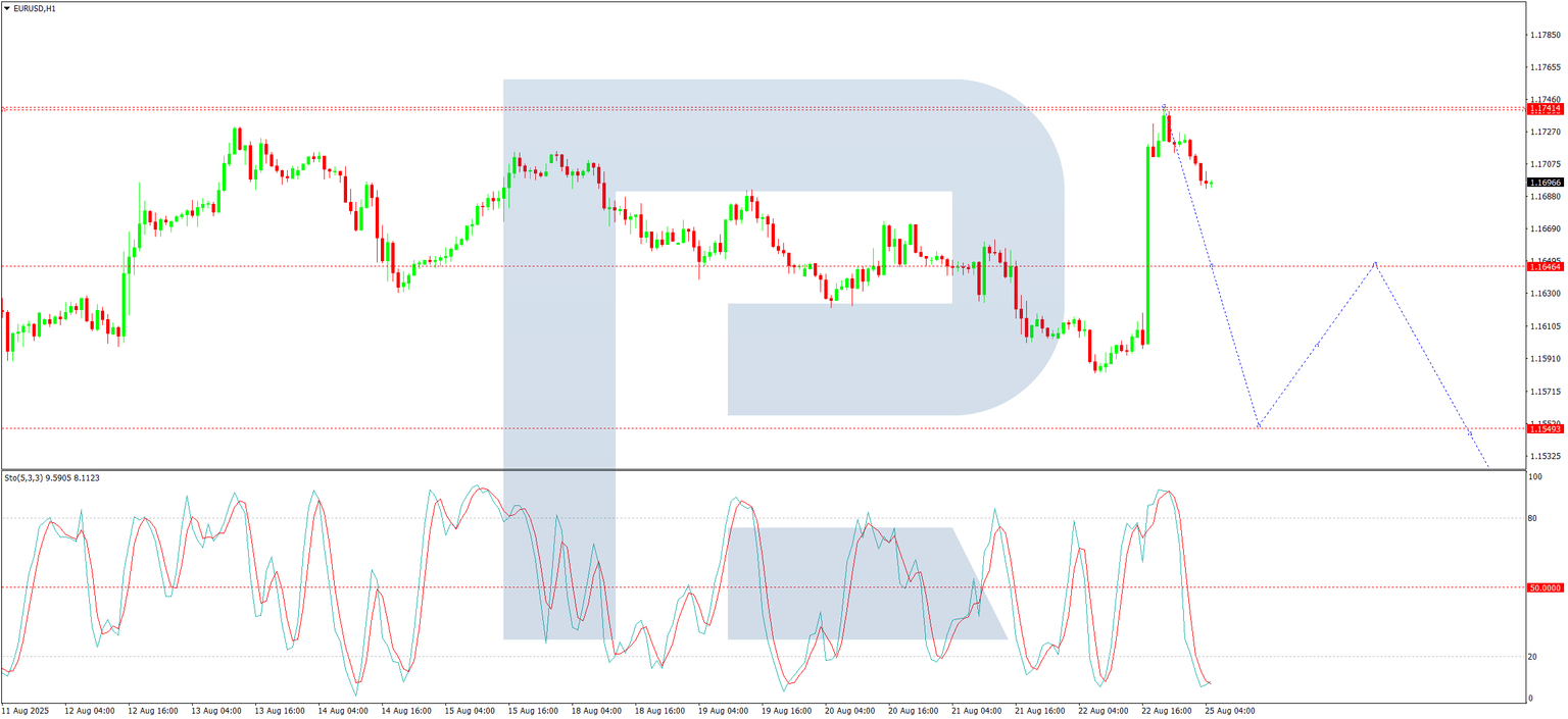 On the H1 chart, the market completed an ascending wave to the 1.1742 level and subsequently formed a consolidation range below it. The price has now broken downwards out of this range. The immediate outlook suggests a high probability of a further decline towards the 1.1664 support level. Following this, a corrective bounce towards 1.1694 is possible. The broader structure is then expected to resume its downward trajectory, targeting 1.1590, with the ultimate bearish objective for the wave structure seen at 1.1550. This view is corroborated by the Stochastic oscillator, whose signal line is currently below the 50 midline and is trending sharply lower towards the 20 level.