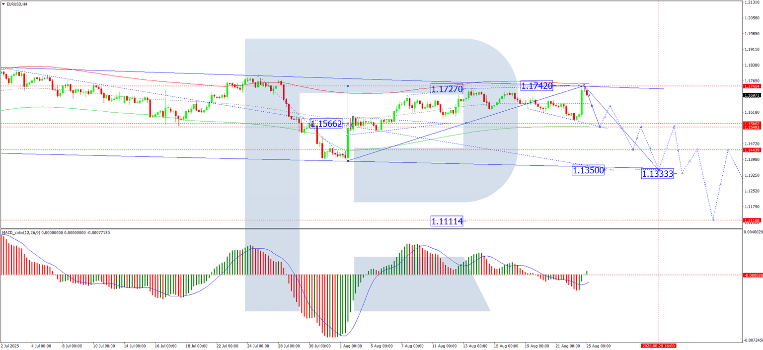On the H4 chart, the market has formed a consolidation range around the 1.1566 level. Following an upward breakout, the corrective wave appears to have completed at the 1.1742 high. The primary focus is now on the potential initiation of a new bearish wave targeting the 1.1550 level. This scenario is technically supported by the MACD indicator, whose signal line remains below zero and is pointing decisively lower.
