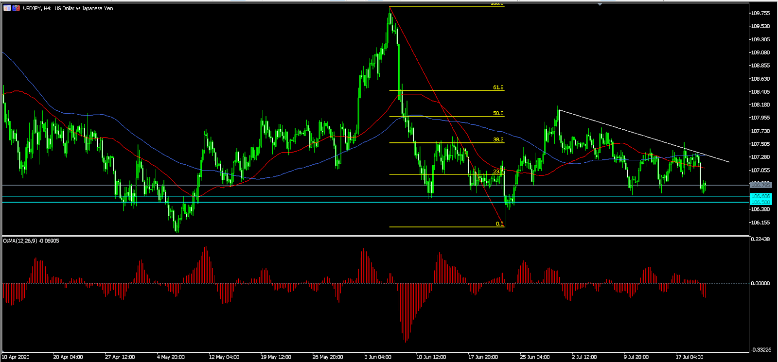 The USD/JPY pair dropped to 106.65, which is the lowest it has been since July 15. On the four-hour chart, the price is below the short and medium-term moving averages. It is also below the 23.6% Fibonacci retracement level. Also, the pair has formed a triple bottom and a descending triangle pattern. This means that the price is likely to continue falling as bears target the next resistance at 106.50.