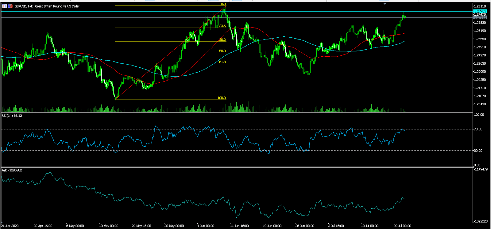 The GBP/USD pair rose to an intraday high of 1.2770, which was the highest level since June this year. The price is above the 23.6% Fibonacci retracement on the four-hour chart. It is also above the 50-day and 100-day simple moving averages. Also, the RSI has jumped to its highest point since early this month. The accumulation/distribution indicator has also risen. Therefore, the pair is likely to continue rising, with the next target being at 1.2800.