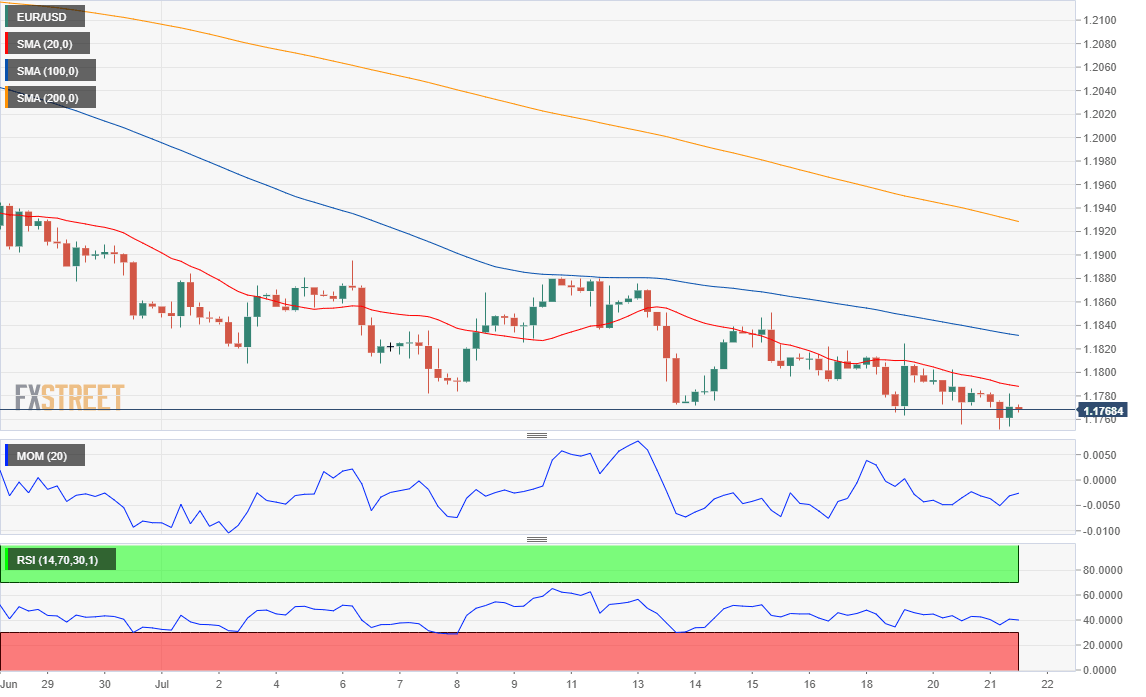 Ahead of the announcement, the EUR/USD pair is under strong selling pressure, trading at its lowest in three months. The pair is bearish and poised to retest the March monthly low at 1.1703. Once below the latter, the slump may extend toward the 1.1660 price zone, while reaffirming a mid-term bearish trend. To the upside, the level to watch is 1.1840, as a recovery above it could see the pair approaching the 1.1900 figure.