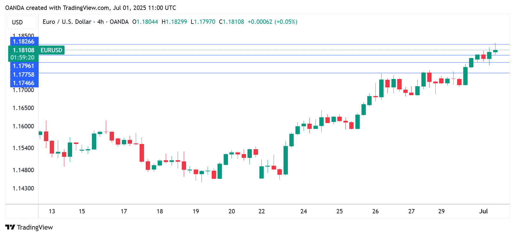 EUR/USD has pushed above resistance at 1.1796. Above, there is resistance at 1.1826.