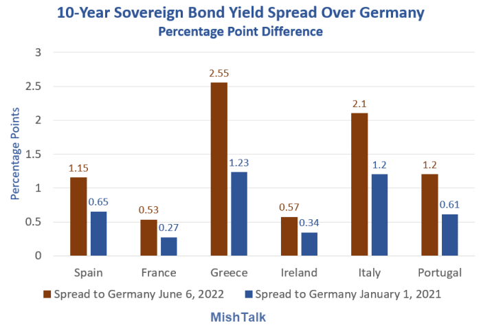 Widening spreads have the ECB alarmed. The Bloomberg article ECB Policymakers Will Ask Lagarde to Be Tough on Fragmentation is what inspired this post.