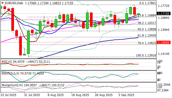 Technical picture on daily chart is predominantly bullish, though early next week’s daily cloud twist would be magnetic and attract bears for probe through 1.1690 and attack at next key levels at 1.1630/10 zone (Fibo 38.2%/Sep 2,3 higher lows.