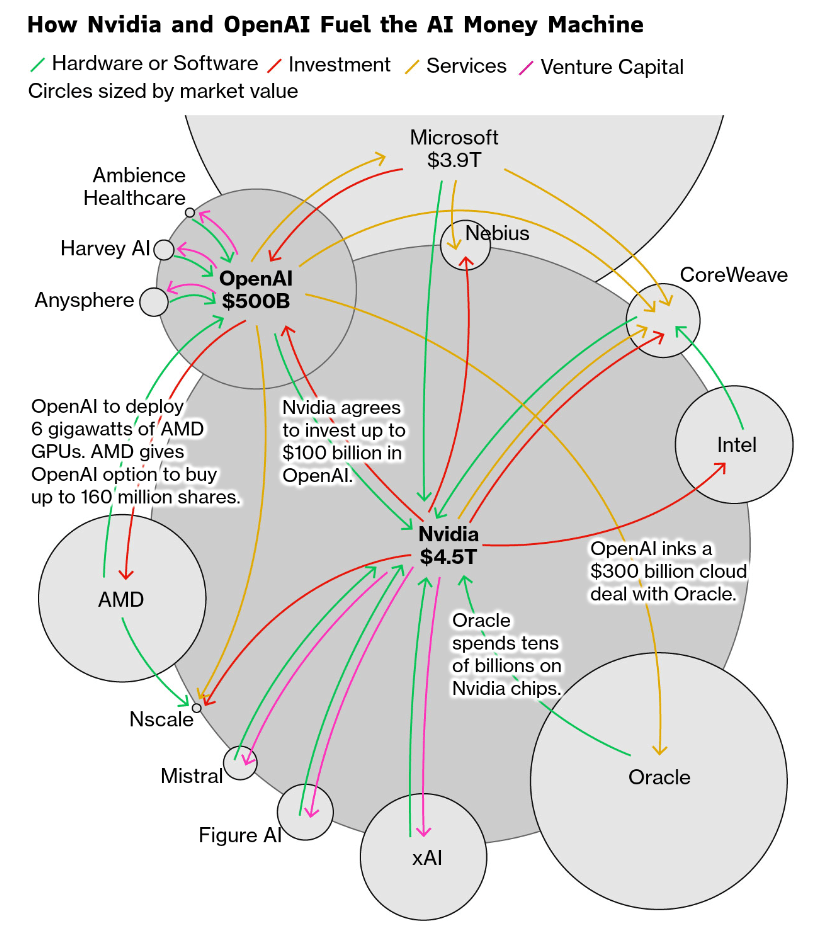 A huge topic of conversation was the explosion higher in debasement trades and the Ouroboros Bubble in US tech. NVDA receives money from MAG7, they give it to AMD and INTC and OpenAI and those guys come back and work with or buy from NVDA. This triggers more buying of tech stocks, which increases the US weighting in MSCI World, which forces global investors to buy more US tech, which increases the wealth of the richest Americans, and they spend like crazy. This graphic from a nice piece on Bloomberg captures the circularity quite well.