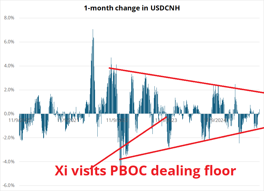Consensus is that USDCNH is effectively pegged and that’s not going to change anytime soon. The net outflows story has turned to a net inflows story as China becomes investable again and corporates are hoarding USD. A significantly stronger CNH is possible into year end, while CNH weakening appears to be mostly off the table. Xi’s visit to the PBOC in October 2023 appears to have been the approximate start of the CNH quasi-pegging regime.
