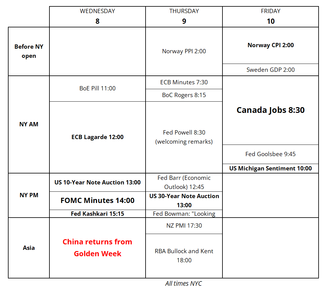 A weird-looking calendar this week because I was off Monday and Tuesday. While there are many Fed speakers this week, most of them are simply offering opening remarks or talking about community banking. FOMC Minutes could be interesting today, and we get Canada Jobs on Friday.