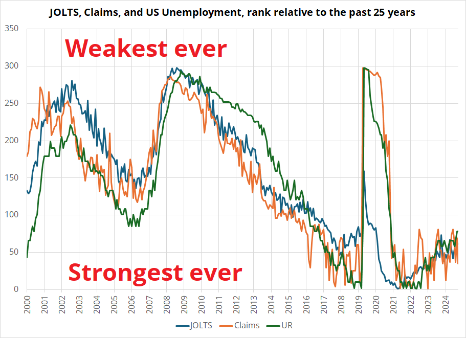 Prong 2: The second reason people are short dollars is the cyclical story, and again I don’t buy it. The US labor market has weakened but remains strong relative to history despite negative changes. JOLTS offers a good example, but you can apply the following logic to Initial Claims and the Unemployment Rate, too. Yes, JOLTS has collapsed from the overheated levels of the strongest jobs market in my lifetime. But it’s still around the best level it ever saw from 2000 to 2018. Same with UR and Claims. The focus on changes has obscured the strength of the levels.