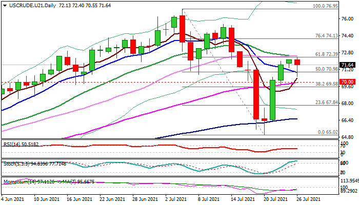 WTI oil remains steady on Monday, following strong rebound in past three days (up 8.5%), but the action faces headwinds from strong resistances at $72.39/50 (Fibo 61.8% of $76.95/$65.02 pullback / converged 20/30DMA’s).