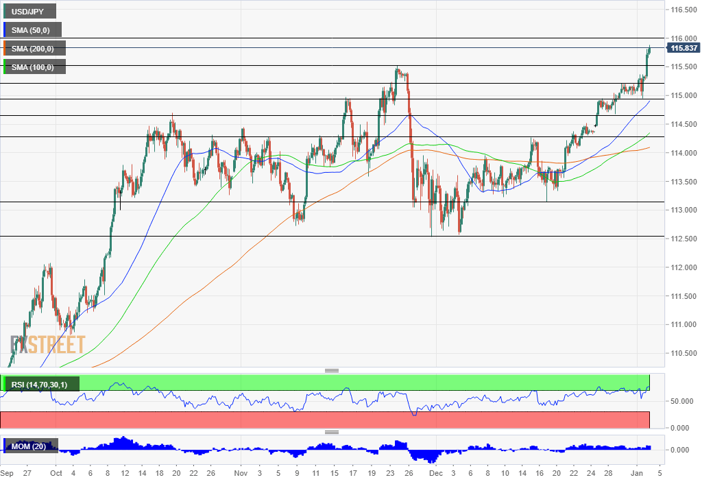 In the shorter term, USD/JPY is trading in overbought territory according to the four-hour chart, as the RSI is well above the 70 level. That implies a correction. However, the trend remains to the upside and the pair could tackle 116 in short order. Further above, 116.50 is eyed.