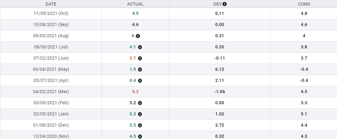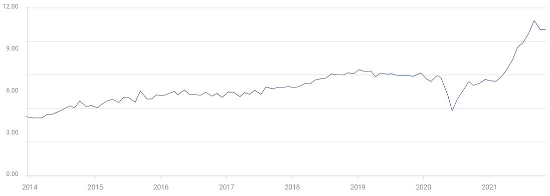 Despite the nationwide shortage of workers, wage increases have not kept pace with soaring inflation. Annual real income (wages minus inflation) have fallen every month since March. Average Hourly Earnings (AHE) have averaged a 3.9% annual gain for those seven months and have climbed from 0.4% in April to 4.9% in October.