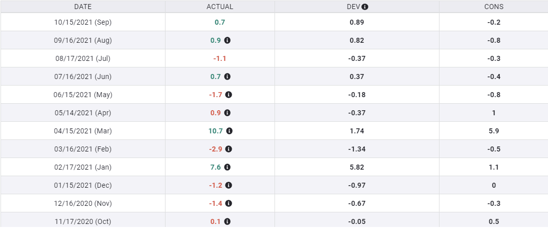 Retail Sales have been essentially flat over the past six months from April, averaging 0.07%, though they were stronger in August and September at 0.9% and 0.7%. October’s figures will be reported on Tuesday November 16 and are forecast to be unchanged at 0.7%.
