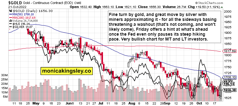 It‘s not only about the steep rise in volume, but about the miners confirming both on a daily basis and since early Sep. First it‘ll be silver, then gold with miners who would turn – we‘re close to the opening stage in the upswing, but not there yet unless the Fed nears its pause. Too early yet to talk about PMs decoupling.